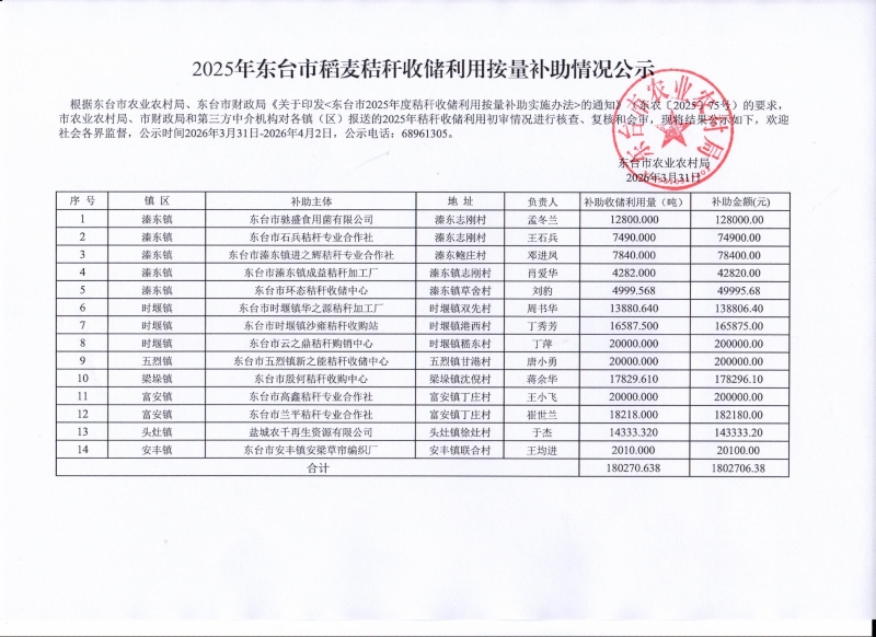 2025年东台市稻麦秸秆收储利用按量补助情况公示