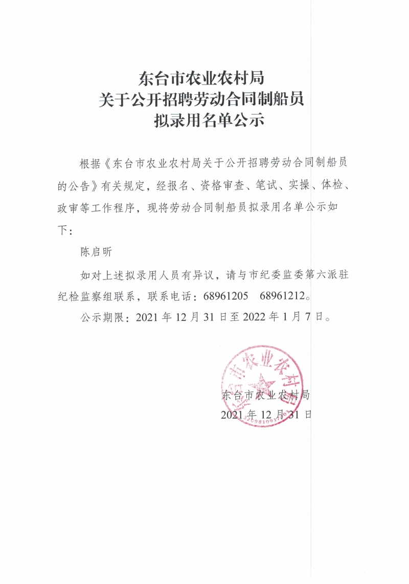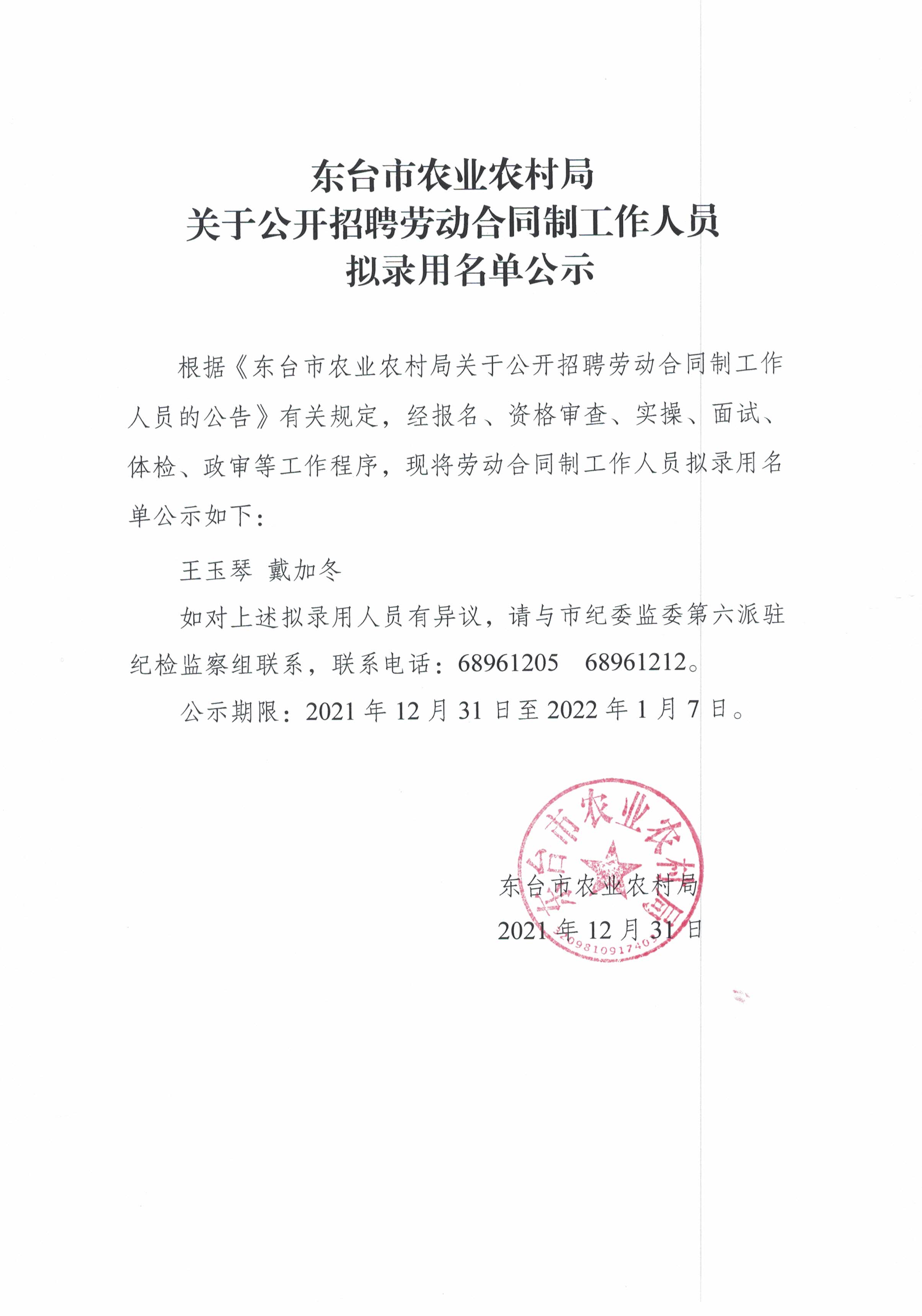东台市农业农村局关于公开招聘劳动合同制工作人员拟录用名单公示