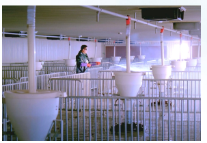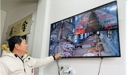 一行人“入乡随俗”,只能通过设置在该场办公室内的显示大屏探视。探头遍及猪场各角落,门口、猪场四周及猪场内部,旋转的、固定的均有,24小时不间断工作。通过调取猪场内部探头看到,肥壮、白净的生猪或躺着,或悠闲地扭着肥臀踱步,饲养员一过来,就见躺着的生猪敏捷弹跳而起,悠闲散步的猪也靠拢过来,群猪争相抢食,开启美妙的午餐时刻。