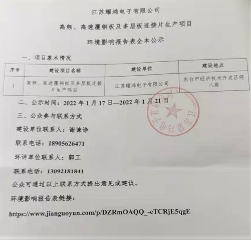 江苏耀鸿电子有限公司高频、高速覆铜板及多层板连接片生产项目环境影响报告表全本公式