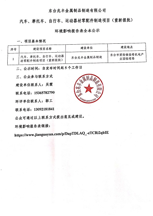 东台兆丰金属制品制造有限公司汽车、摩托车、自行车、运动器材零配件制造项目(重新报批)文本公示