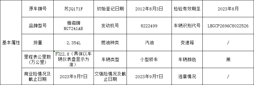 一、竞价标的物:苏JQ171F雅阁牌小型轿车,不含车牌转让。