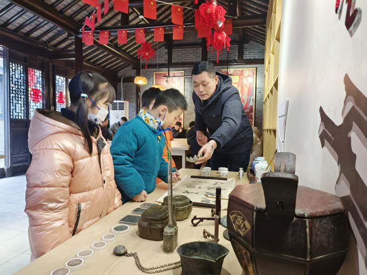 非遗研学堂内,一场“品鉴民俗物件重拾岁月印记”的美学课堂吸引不少亲子家庭参加。景区吉宝轩收藏馆馆长吉志才,借助PPT演示,为小朋友们讲解门当、石权、盐场税票等古镇特色老物件。互动鉴赏环节,更是不时引来小朋友的惊叹声。大家在老师的引导下近距离观摩一件件珍贵藏品,领略匠人精湛技艺,感受古镇文化脉搏。参加非遗研学的小朋友肖腾宇表示,自己见到了很多没见过的东西,比如保温桶、手炉、缝纫机、笔墨纸砚,觉得古人很聪明,对历史也更感兴趣。