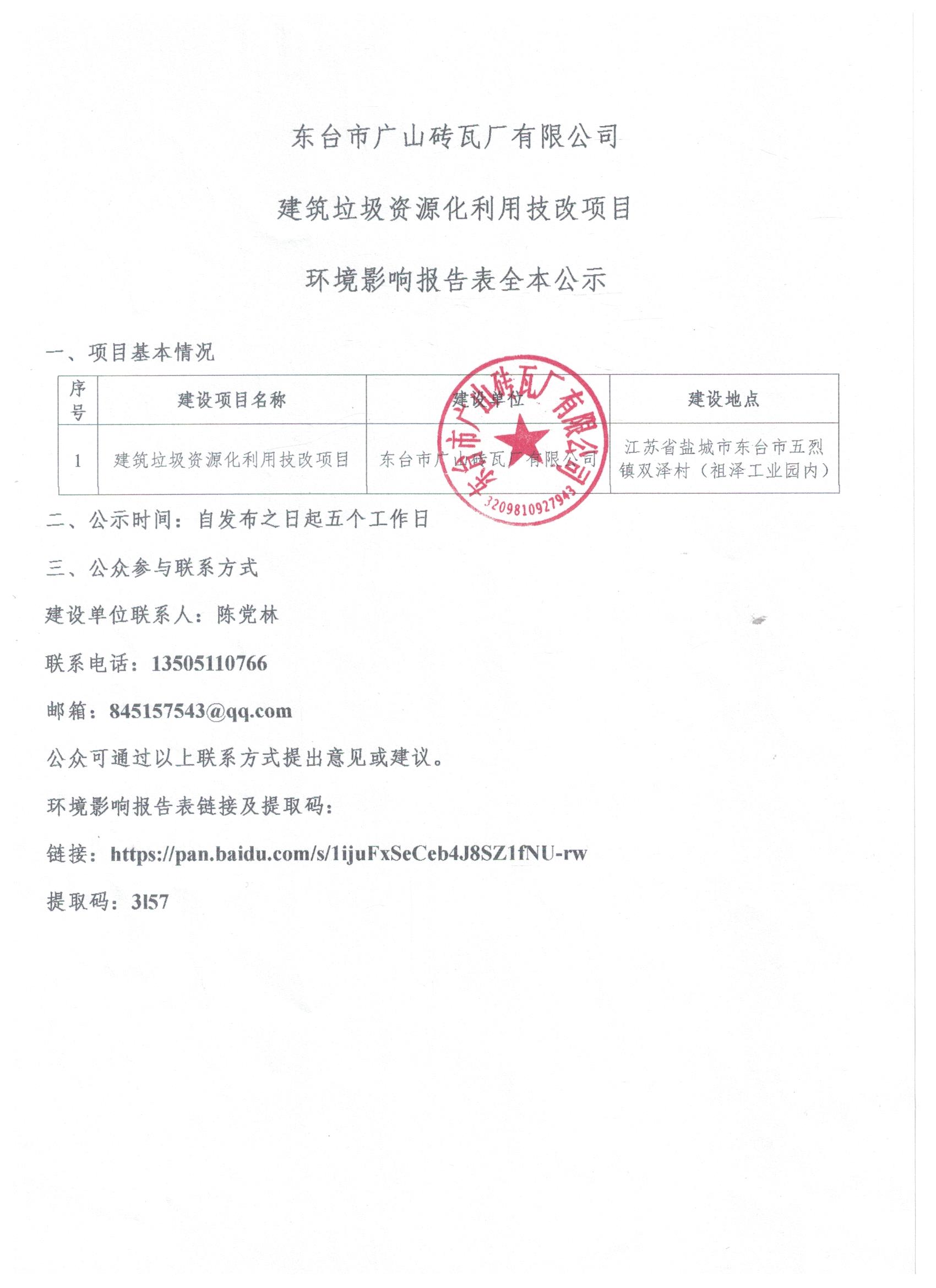 东台市广山砖瓦厂有限公司建筑垃圾资源化利用技改项目全本公示