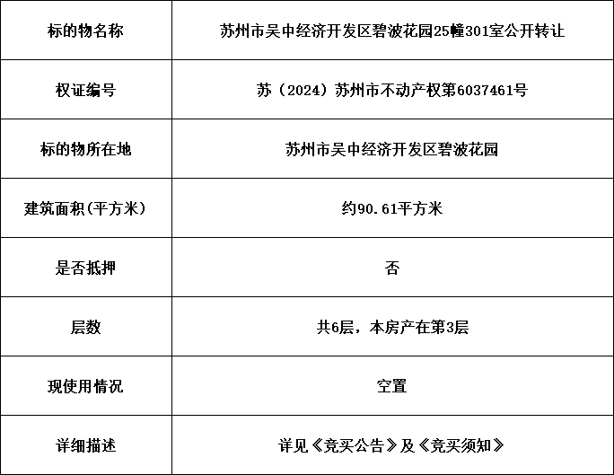 一、竞价标的物:苏州市吴中经济开发区碧波花园25幢301室,该房产建筑面积约为90.61平方米,土地使用权面积为20.4平方米,为混合结构,本建筑楼共6层,本房产为第3层,使用权类型为划拨。