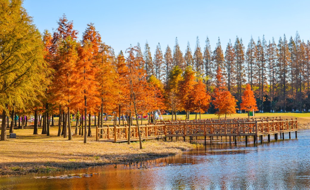 阳光穿透林间,洒下斑驳光影。满林尽染,像打翻了暖调调色盘,为冬日添了鲜活暖意。园内打造2公里水杉长廊、800米空中栈道、“森林之眼”观景台等特色游览线路,游客可漫步红金隧道、登台俯瞰万亩红林,或乘森林小火车穿行林海,湿地长廊“水中有杉”的倒影景观更成天然摄影棚。