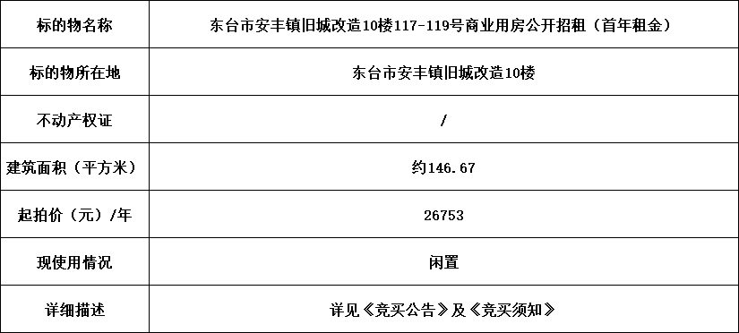 一、竞价标的物:东台市安丰镇旧城改造10楼117-119号商业用房,建筑面积约为146.67平方米。