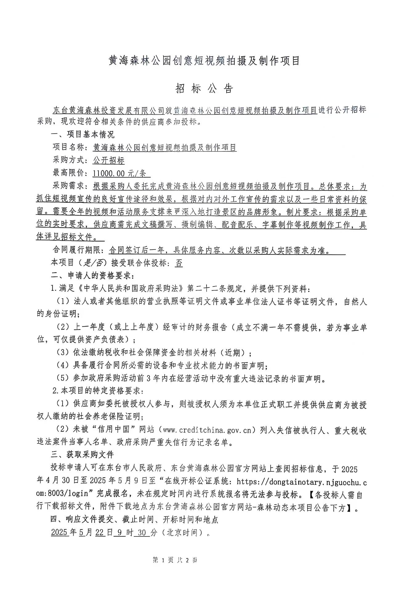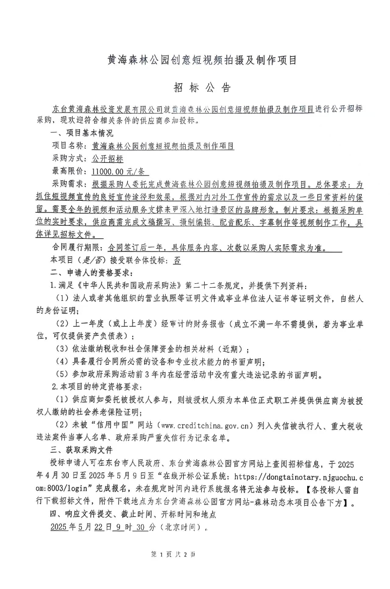 黄海森林公园创意短视频拍摄及制作项目招标公告