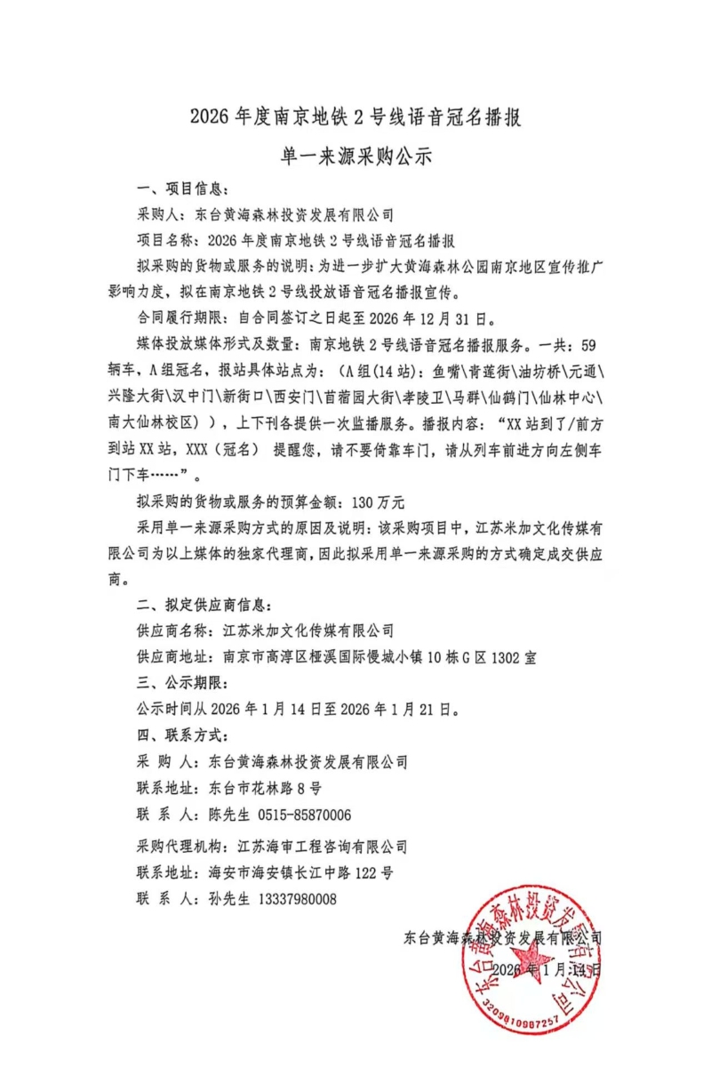 2026年度南京地铁2号线语音冠名播报单一来源采购公示