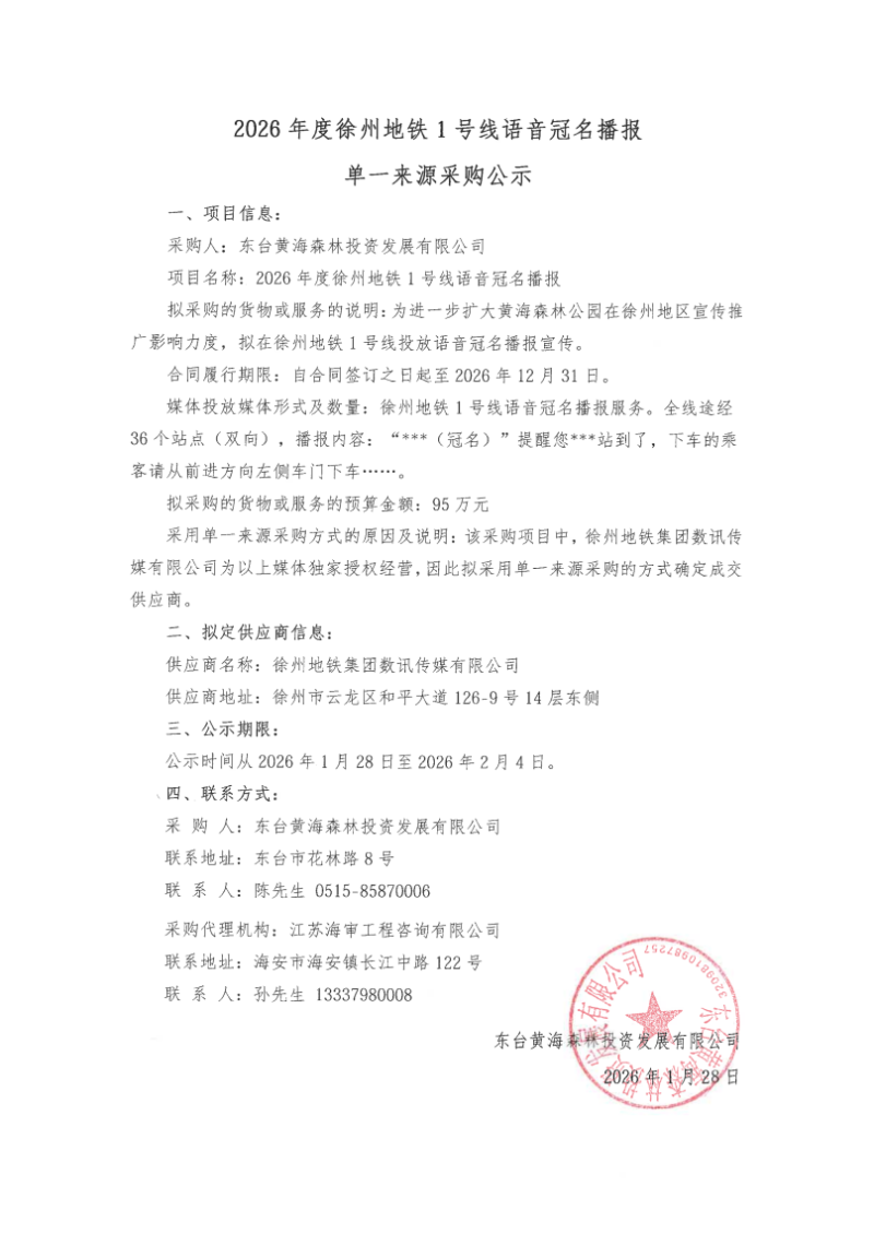 2026年度徐州地铁1号线语音冠名播报单一来源采购公示
