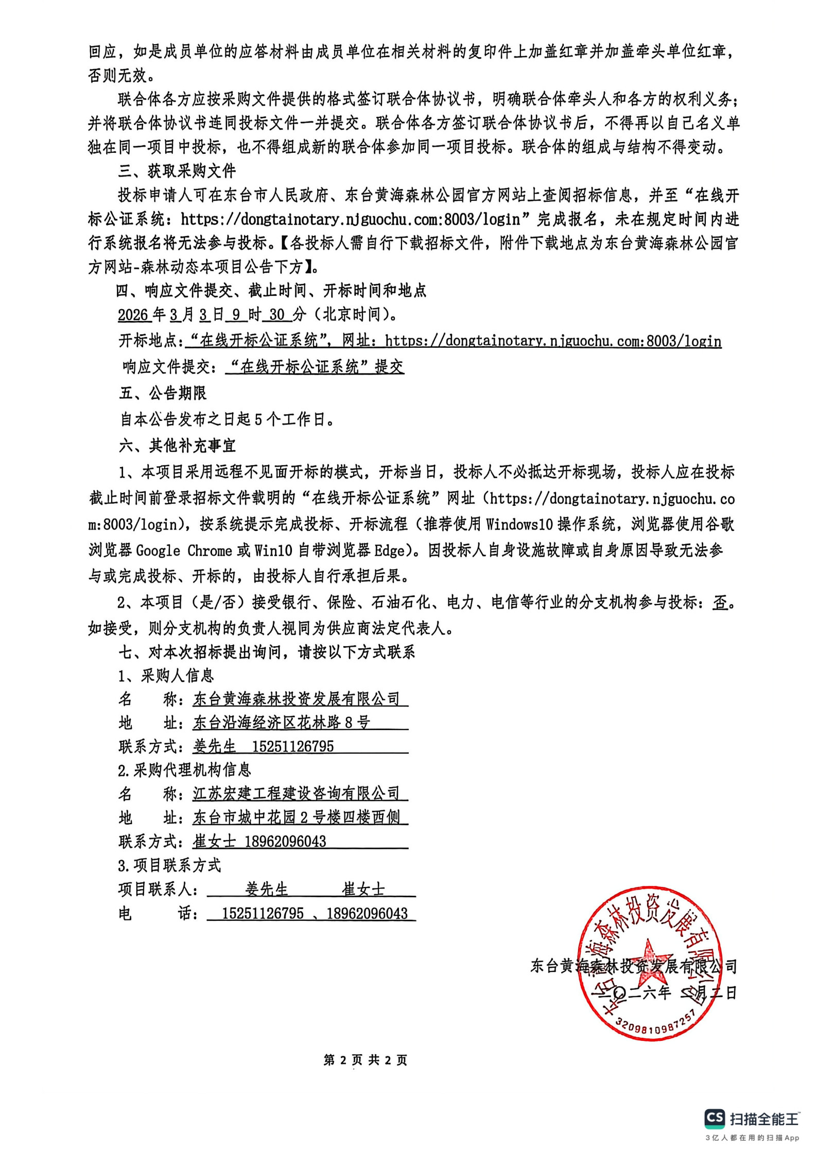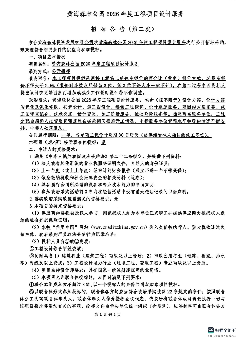 黄海森林公园2026年度工程项目设计服务招标公告(第二次)