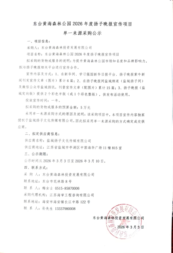 东台黄海森林公园2026年度扬子晚报宣传项目单一来源采购公示