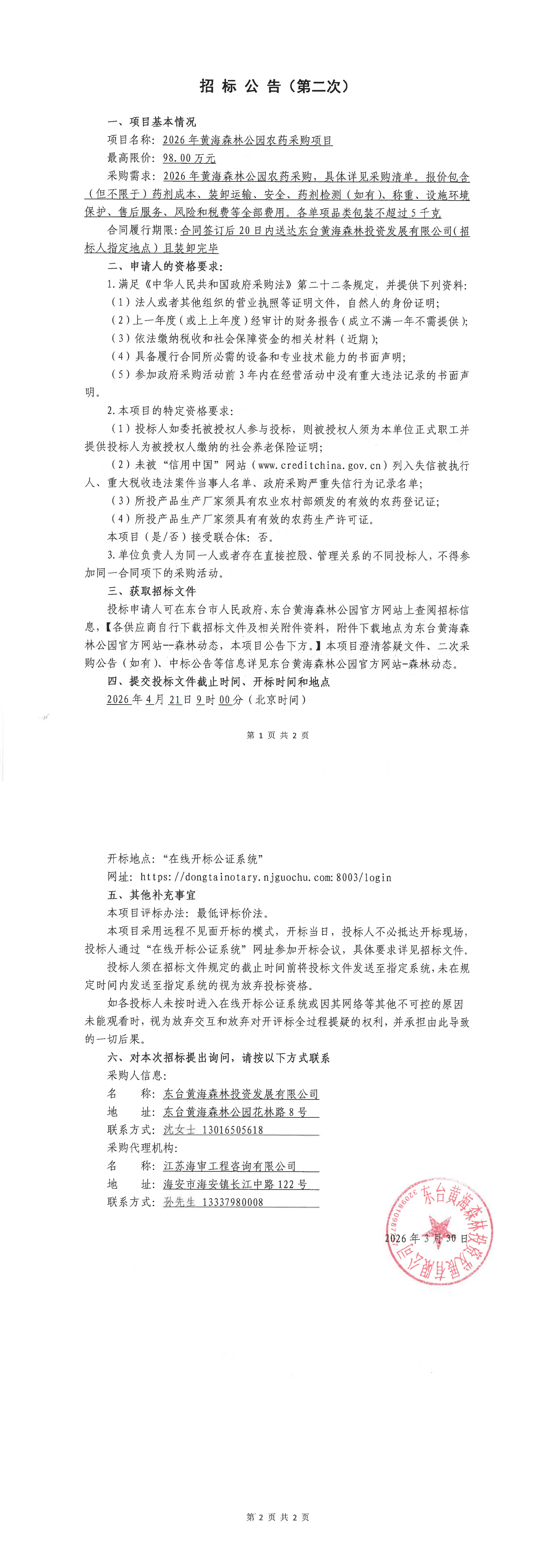 2026年黄海森林公园农药采购项目招标公告(第二次)
