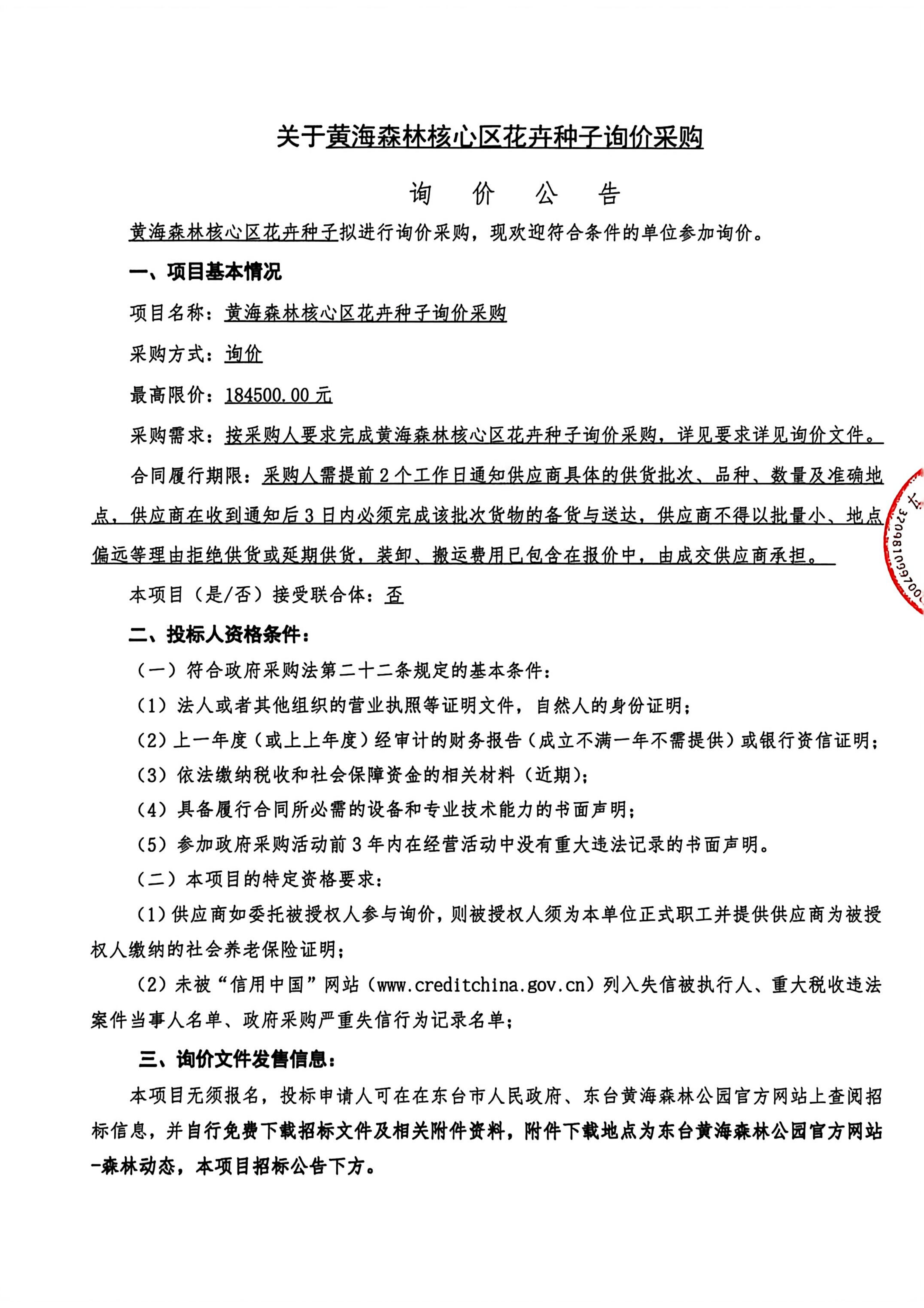 黄海森林核心区花卉种子询价公告