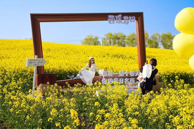 微风拂过,西溪花田成片金黄花海绵延不绝,卡通小蜜蜂、镜框、“上春山”等创意打卡景观错落分布其间。三五成群的市民游客或举家出游,在花间驻足留影、信步赏春。骑马拍照的项目旁,不少家长带着小朋友排起小队,不时传来欢笑声。几位韩国游客举着手机四处取景,对眼前这片田园风光赞不绝口。