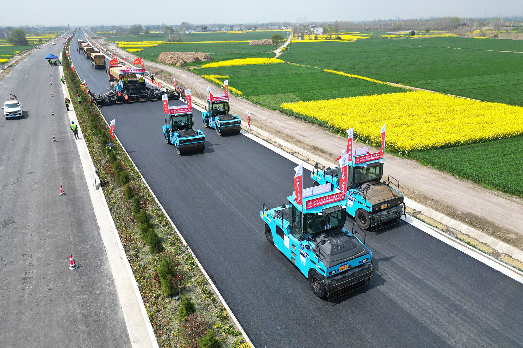 春光正好,建设正酣。作为东兴高速向东延伸至东台沿海腹地的关键路段,东兴高速东延工程正全力推进沥青中面层施工,向着今年竣工的目标加压奋进。这条承载着区域发展期盼的快速通道,正以“智慧铺路”的新气象,不断增加黑色路面的厚度、延伸其长度。